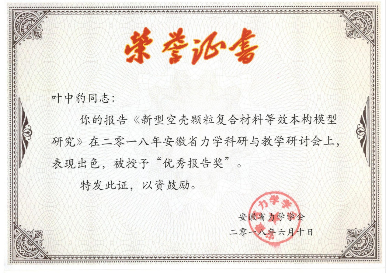 下午我校教师叶中豹作了“新型空壳颗粒复合材料等效本构模型研究”学术交流报告,因表现出色,被授予“优秀报告奖”。