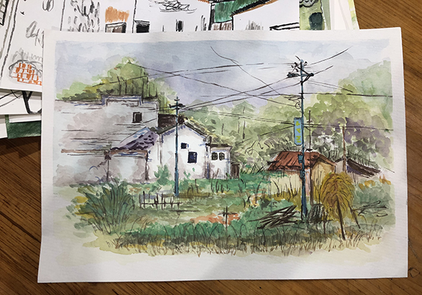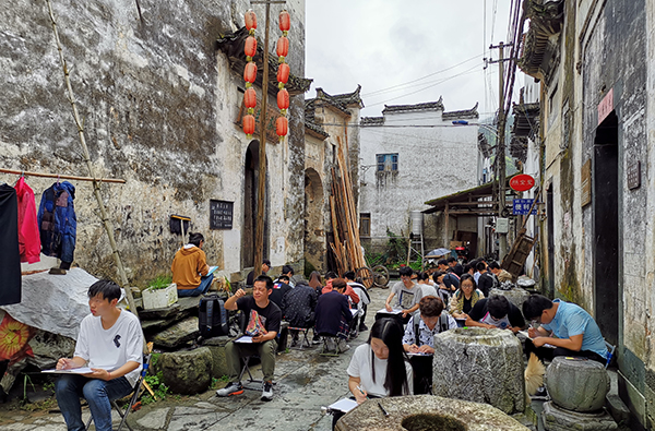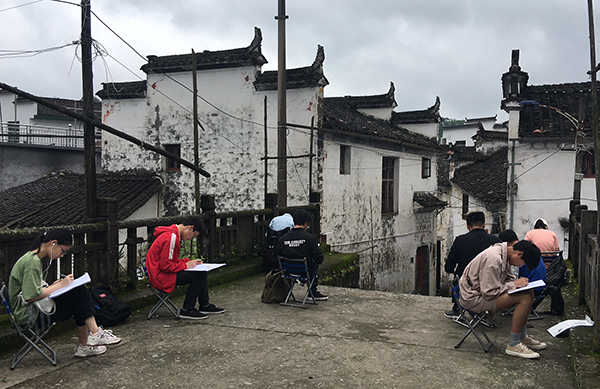 4月15日,学生来到风景如画的婺源理坑村,这里山清水秀,气候宜人,建筑以粉墙、黛瓦、马头墙为特征,以砖雕、木雕、石雕为装饰特色,以高宅、大厅、天井为居家特点。在为期10天的写生过程中,学生在带队教师周宇、魏雅萍、李蓓、汪艳、金伟、高秀娟、周蕾、张斯媛的指导下,出色地完成了个人的写生作业。白天,学生们按规定时间走进村中,选取好的景观或建筑视角,完成当天的作业量,一张张生动的速写作品跃然纸上,专业指导教师在旁一一进行协助指导。晚上,教师对学生当天的作业进行批阅检查,讲解新的绘图技法,督促学生改进提高。学生们聚集在一起交流收获与感悟,听取教师的点评。同时,教师对学生寝室进行清查,督促学生按时休息,并叮嘱学生注意在外居住的安全事项。