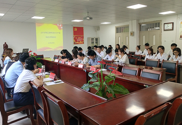 6月5日上午,土木与环境工程学院举办了党总支2018届毕业生党员座谈活动。土木与环境工程学院党总支书记邵玲、党总支副书记蒋亚龙、组织专员张斯媛,各学生支部书记、全体毕业生党员参加会议。座谈会上,全体党员重温入党誓词,大家在朗朗庄严的誓词中,重温刚入党时的激情,牢记初心和使命,紧接着党员代表宣读文明离校倡议书,倡议全体党员毕业生在文明离校过程中当好排头兵,站好最后一班岗,积极调动广大毕业生的爱校、爱院热情,努力配合开展工作,发挥党员的先锋模范作用,带领毕业生们文明、互助、安全、有序离校。随后,党员学生们积极发言交流,总结入党以来所取得的进步、实习感悟和对未来的展望。最后,邵玲、蒋亚龙作总结发言,祝愿大家在未来的工作岗位上以党员标准要求自己,离开学校是新的开始,愿所有学子都展翅高飞、大展宏图,常回家看看。