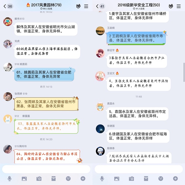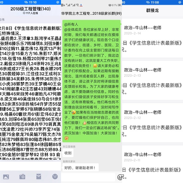 辅导员们继续加强学管工作的力度,服从学校的安排,第一时间在线办公,在学校和学生之间建立有效联系。关注班级QQ群,不放松每日排查,对于疏忽回复的同学,会逐一提醒。做好学生心理疏导工作,保持健康状态等待疫情结束。在工作过程中创新采用“群接龙汇报”、“班干/党员同学包干对接”、“先进榜样引导”、“每日健身套餐”、“抗疫阅读书香寒假”等特色活动,丰富假期生活,倡导志愿公益活动,加强身体锻炼,提升学风等。保持高度的政治敏锐感,积极配合党和国家的指示和措施,遏制和打击投机分子,坚决抵制谣言。