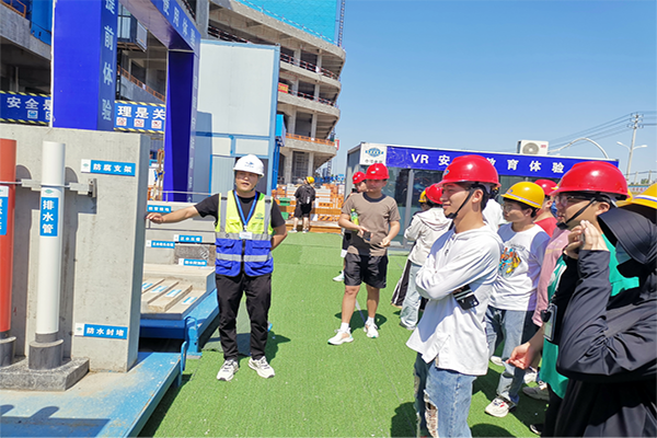 活动伊始,查显卫、李永良、李继然、阚伟民、孙大未五位企业导师带领同学们参观了项目部的安全文化园,着重介绍了工程安全管理内容;随后,师生一行参观了钢筋工程、混凝土工程和砌筑工程施工过程,企业人员向同学们详细介绍每个工种的施工技术。