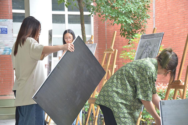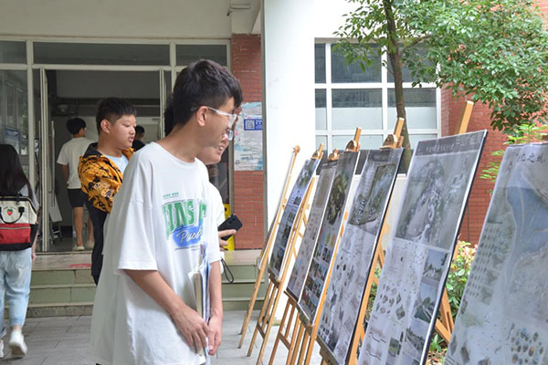 笔墨的挥洒,思想的飞扬。多维的融动,未来的畅想。设计展包含城市绿地改造、商业空间设计、河道景观设计、乡村振兴设计、花园设计等内容,设计主题丰富。展览期间,引得往返师生纷纷驻足欣赏并讨论,有人喜欢浪漫古典的《花酒间》;有人喜欢新颖别致的《沪动共创美丽家园》;有人钟情于现代灵动的《知也,智也》;有人沉醉于鲜艳烂漫的《胭脂几重最美》;也有人震惊于《北岗综合公园》的制图技术。“在维护秩序的同时,我也在观摩学姐学长的作品,很震惊他们优秀的制图技术,希望以后我也能制出这么优秀的设计图”,“由于专业不同我不好过多评价,但每一幅图都很好看,制作它们的人一定很用心”,现场井然有序、讨论不断。