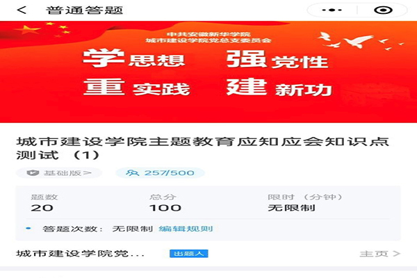 本网讯(通讯员:凌青霞) 为促进主题教育工作开展,掌握我院党员政治理论学习成效,巩固学习成果。经城市建设学院党总支委员会研究决定,6月5日至6月16日期间,组织全院师生党员开展主题教育应知应会知识测试。
