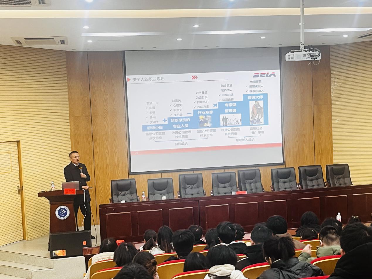 本网讯(通讯员:刘雪莉)为增强安全工程专业学生的职业规划意识,对他们进行就业指导和职业生涯教育,城市建设学院于2024年12月23日上午在学术报告厅举办了一场主题为“HSE人的‘HSE’——安全生产管理人员的职业规划”的讲座。本次讲座特邀安徽拜亚注册安全工程师事务所有限公司创始人谭守臣作为主讲嘉宾。安全工程专业教师蒋亚龙、刘雪莉及大一到大四的全体学生参会,由蒋亚龙主持本次讲座。