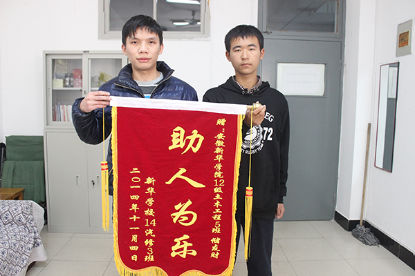 本网讯(通讯员 汪鹏程,摄影 周成)11月17日的下午,新华中专学校2014级汽修专业学生张龙在其辅导员的陪同下携带一面锦旗来到土木与环境工程学院,对12级土木工程5班的储友财同学助人为乐的行为表示感谢。