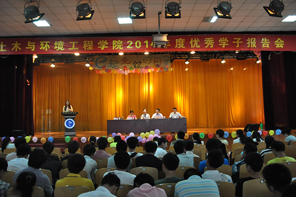 本网讯(通讯员 王修武,摄影 杨志敏 )为进一步加强学风建设,发挥榜样示范作用,营造良好的学习氛围。6月18日,土木与环境工程学院在大礼堂举办2014年优秀学子报告会。会议由行政副院长计勇主持,教学副院长蒋亚龙、团总支书记王修武、教学秘书罗月颖、行政秘书俞士毛和全体辅导员出席了报告会,各班级学生代表近千人聆听了报告。