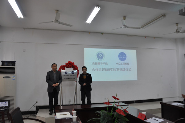 本网讯(通讯员 张杨 摄影 张杨)11月9日上午,安徽新华学院与申众工程科技有限责任公司合作共建BIM实验室揭牌仪式在土木与环境工程学院举行。申众工程科技有限责任公司总经理汤裕坤,副总经理虞明松、王竹筠,安徽新华学院副校长杨世国,土木与环境工程学院执行院长朱兆健,副院长蒋亚龙、杨光,院长助理谢汝强,基层管理人员及土木工程系、工程管理系师生参会。