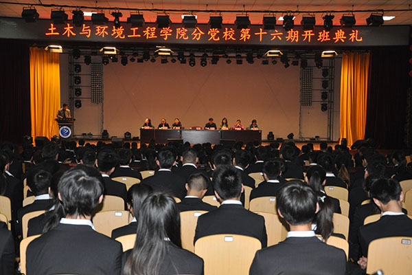 本网讯(通讯员:张杨 摄影:彭凯)4月5日中午,土木与环境工程学院第十六期入党积极分子培训班开班典礼在校大礼堂内隆重举行。土木与环境工程学院党总支书记、执行院长蒋亚龙,党总支副书记、行政副院长、分党校校长杨光,团总支书记、学管秘书魏高莉,学生党支部书记牛山林、王菁、何倍、盛翠娟,本期党校班主任赵群、田园以及200多名参训学员参加本次开班典礼。