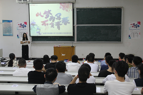 宣讲会现场,合肥万科企业股份有限公司人力资源部经理汪贵平首先播放了一则宣传片,以视频的形式向同学们介绍了万科企业股份有限公司几十年的发展史,强调万科企业的人文关怀和对运动的崇尚。现场更是来了一场平板撑大比拼,在场的学生均被氛围感染,跃跃欲试,比赛结束后,汪贵平为坚持到最后的五位同学赠送小礼物。
