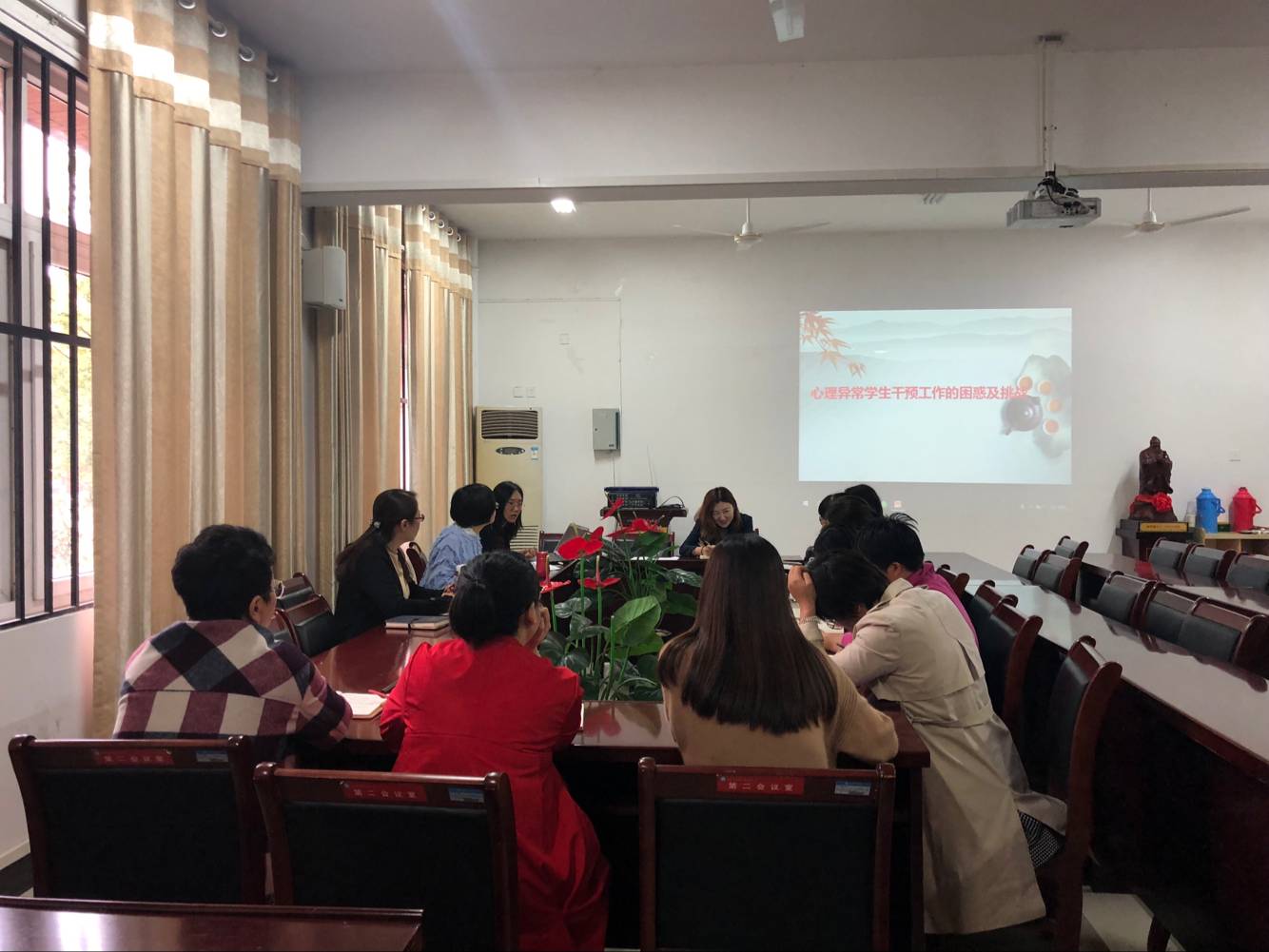 何倍从发现问题学生、解决问题症状、干预工作处理三个方面向参会人员讲解。她表示,首先,可以从学生信息表填写、朋友圈说说、心理委员信息反馈等几个方面发现心理异常学生,从知、情、意、行四点解读心理异常学生问题的主要症状。随后,可通过约谈的方式进行干预工作处理,并结合具体的案列,讲解如何开展心理健康教育工作。培训结束后,辅导员们就关于心理异常学生干预的工作问题进行充分地交流探讨。