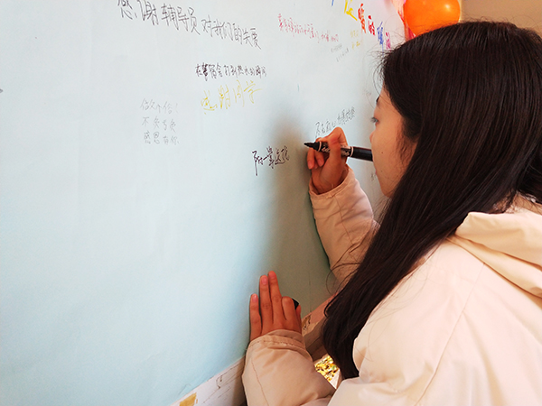 接着,负责人向大家解释了活动的规则与意义,鼓励大家积极参与。随即,不同颜色不同字体的话语渐渐写满了展板。上面有说“学姐学长的帮助让初进大学校园的他们感受到了温暖”,也有说“室友的细心关怀让第一次离开家人的他们感受到了温暖”。当然,其中不乏有一些诙谐的语句,比如“支付宝到账xxx元”,再比如收到放假的通知等等。这些话语表达了学生的真情实意,同时通过这次的展板留言活动传递了温暖!仅两天的时间,这些心理展板便成了校园中最靓丽的风景之一!