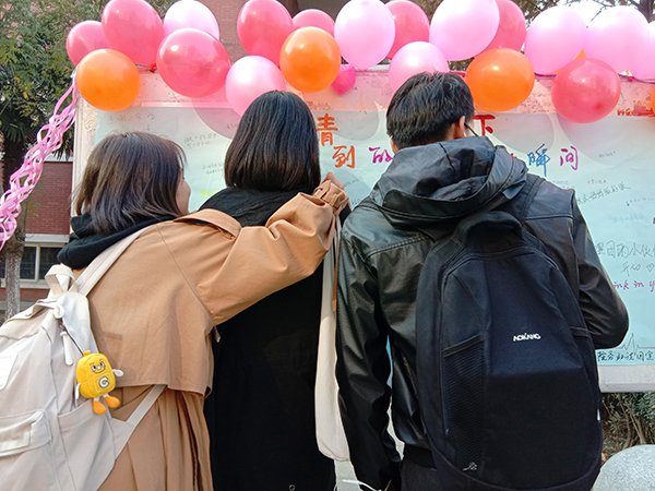 活动开始之前,助理团工作人员在教学楼前设立了多个展板,并用气球彩带等物品装饰它们,漂亮美观的展板与活跃欢快的气氛瞬间吸引了许多学生的驻足与观望。