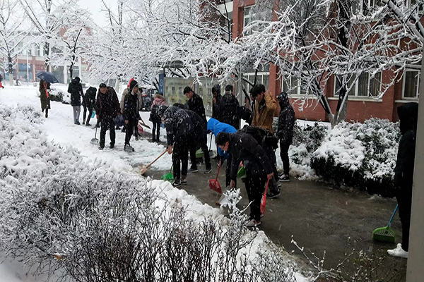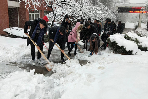 上午八时“清雪应急小组”开始行动,成员们带上铁铲、木铲等除雪工具开始在寒风中作业,将路面积雪清扫到道路两侧。寒风凛冽,同学们清雪的热情毫不减退,清雪工作有序进行。历时一上午,进行了两轮清扫,保证了教学楼与实验楼附近主干道路正常通行,给师生出行带来了便利。