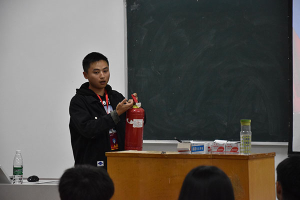 讲座在一个个真实的火灾案例的讲述中开始,消防志愿者大队成员结合相关图片和视频资料,深入浅出地讲解了消防安全的重要性,全面介绍了在日常学习、生活中应注意的消防安全细节以及火灾中如何自救、逃生等消防知识。在火灾发生时,要求学生首先沉着冷静,服从指挥;其次可以沿墙壁边缘逃生,尽量降低身体高度减少吸入有毒气体;再是疏散逃生要有序,按照既定线路快速安全撤离。接着结合典型消防案例,详细地讲解了防火、灭火器使用、正确报警等知识,并对消防器材的正确使用做了细致的讲解。讲座过程中同学们们认真聆听,积极参与,对消防安全知识有了更深刻的了解和认识。在最后的演练中,参与演练的学生按照规定路线,有条不紊地安全撤离。