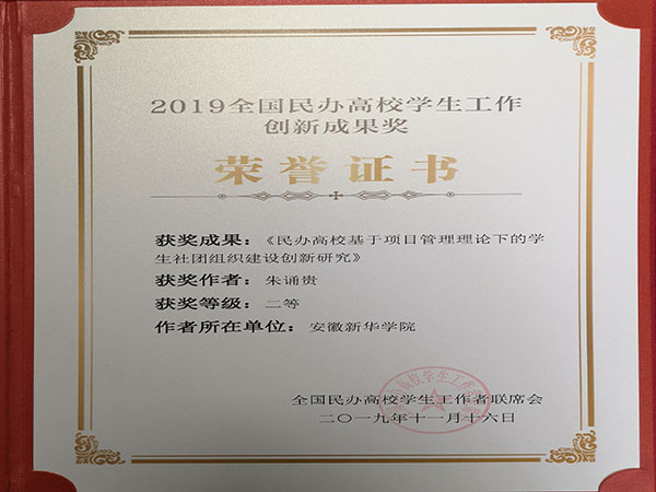 为全面总结上一年度全国民办高校学生工作整体情况,表彰推广学生工作创新成果,举行了“2019年度全国民办高校学生工作创新颁奖典礼”。朱诵贵副院长的“民办高校基于项目管理理论下的学生社团组织建设创新研究”成果,荣获全国民办高校学生创新成果二等奖,相关论文被《百舸争流 奋楫者先——全国民办高校学生工作创新论文集》收录。