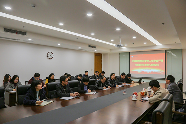 专家组首先在科研办公楼608会议室召开见面会,校领导,教务处、评建办公室、教学质量监控办公室、科研处、人事处、学生处等职能部门负责人及土木与环境工程学院全体管理人员、安全工程部分教师参加了见面会。石秀和代表学校致欢迎辞,对评估专家来校检查指导工作表示欢迎和感谢。他向专家们介绍了安徽新华学院和土木与环境工程学院的发展历程,表示学校高度重视本次专业评估工作,希望专家组对我校安全工程专业发展把脉问诊,同时也希望对我校的建设与发展多提宝贵意见和建议。石必明介绍了评估专家组成情况及进校评估工作的任务分工、工作流程。随后,安全工程专业负责人蒋亚龙博士围绕专业评估指标,从专业定位与规划、师资队伍、课程建设、教学管理、学生培养质量等方面详细介绍了专业现状、特色及发展前景。