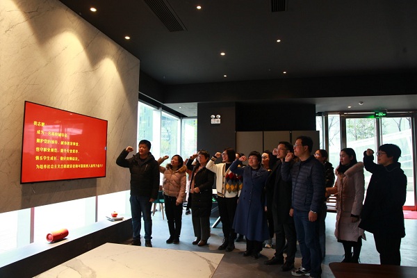 第三部分为“辅导员的初心与使命”——内部交流。首先由学院党总支书记邵玲、副书记蒋亚龙、朱诵贵,带领全体辅导员按照教育部高校辅导员誓词进行宣誓。紧接着全体辅导员依次进行2019年工作述职及经验分享。各位辅导员主要针对学生的日常事务管理、学生干部队伍建设、班风学风培养、突发事件处理、工作能力提升等进行了深入的探讨。