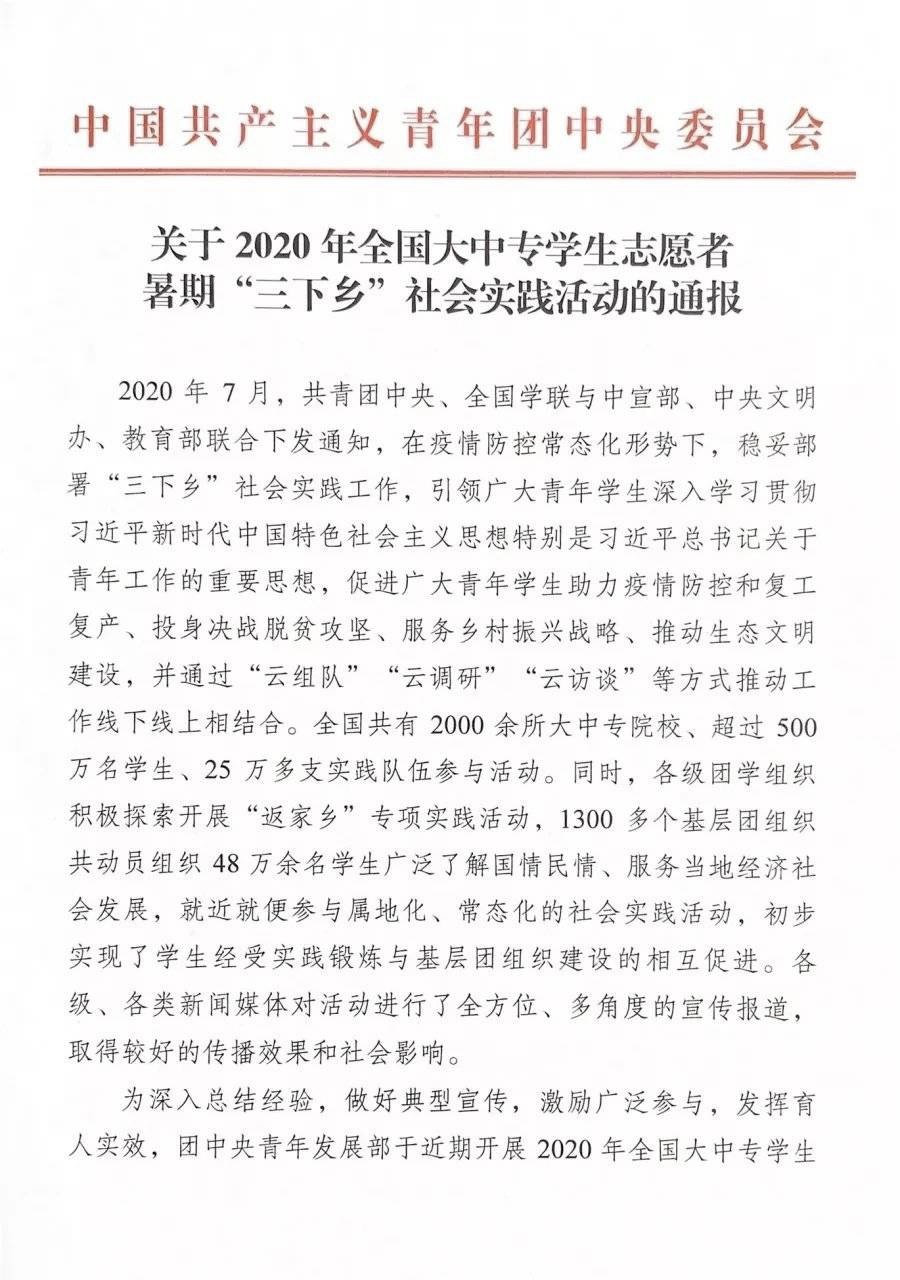 本网讯(通讯员:杨雨婷、王勇杰)近日,土木与环境工程学院“筑梦华彩”社会实践团队从全国25万多支实践队伍中脱颖而出,荣获2020年全国大中专学生志愿者暑期“三下乡”社会实践活动优秀团队称号。土木与环境工程学院团总支书记杨雨婷在省级评选中,被评为2019年全省大中专学生志愿者暑期“三下乡”社会实践活动优秀个人。