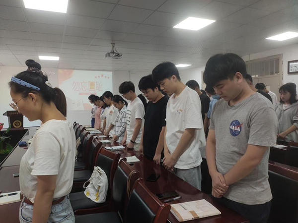 随后,在场全体师生党员伴随勿忘“九一八”撞钟鸣警仪式,全体起立默哀。此次活动结合党史学习教育,以“微课堂”的形式给青年党员上了一节别开生面的党课。在纪念“九一八”事变的同时,也告诫当代青年党员不忘国耻、奋发图强、以史为鉴、开创未来,激励当代青年人为国防、为民族复兴的使命贡献力量。