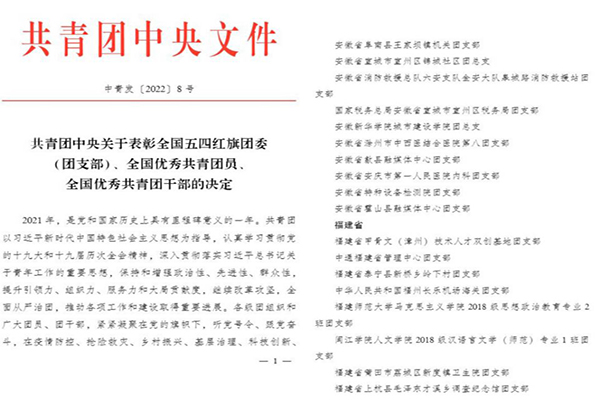 本网讯(通讯员:穆天宇)2022年是中国共青团成立100周年。近日,全国“两红两优”光荣榜揭晓,安徽新华学院城市建设学院团总支获“全国五四红旗团支部”荣誉称号。这是该校首次获得此项殊荣,也是安徽省高校中唯一受表彰的团总支。