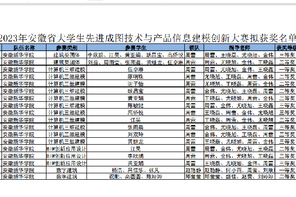 赛事组委会6月结果公示显示,城市建设学院建筑学和工程管理专业学生在此次比赛中再次斩获佳绩,两个参赛团队均获得建筑类团体三等奖。除此之外,在个人赛中,计算机三维建模类共获得一等奖1项,二等奖4项,三等奖6项;数字建筑类共获得一等奖1项,二等奖1项;BIM创新应用设计类共获得二等奖1项,三等奖2项。本次创新大赛中安徽新华学院城市建筑学院学子们共获得18个奖项。
