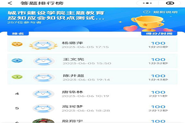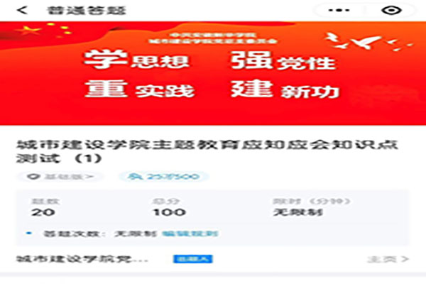 本网讯(通讯员:凌青霞) 为促进主题教育工作开展,掌握我院党员政治理论学习成效,巩固学习成果。经城市建设学院党总支委员会研究决定,6月5日至6月16日期间,组织全院师生党员开展主题教育应知应会知识测试。