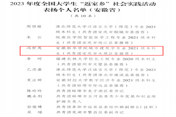 本网讯(通讯员:张安娜)近日,团中央青年发展部发布表扬信,对2023年度全国大学生“返家乡”社会实践活动中表现突出的组织单位、个人和特色项目予以通报表扬。城市建设学院2021级建筑学专业冯世茂同学获通报表扬。