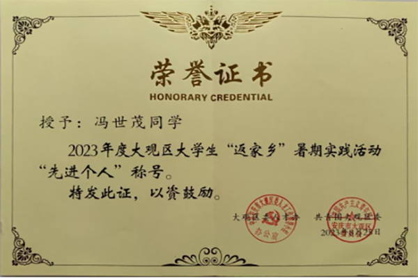 2023年暑期,冯世茂报名参加了安庆市大学生暑期社会实践,被团大观区委视频宣传岗录取,后调至综合岗。他在团区委主要负责统计分配人员、开展创建活动、视频拍摄与剪辑、团区委公众号推文的编辑与发布等。两个月的实践过程中,他协助开展欢迎仪式、研学活动、视频比赛、表彰会议等集体活动;对接各街道、社区举办文明创建志愿活动8场;普法宣讲活动14场;防溺水与防烧烫伤宣讲活动5场;参与视频拍摄与剪辑工作,编辑并发布推文二十余篇。冯世茂圆满完成实践期间各项工作,并受市级媒体报道,展现了新华园青年良好的精神风貌。