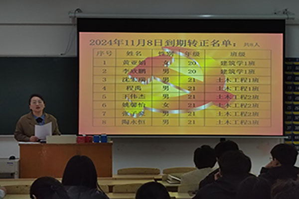 本网讯(通讯员:程禹)为进一步做好党员发展工作,加强党组织队伍建设,增强党员队伍的生机与活力,11月8日下午,城市建设学院第二学生党支部在教一214教室召开预备党员转正大会。参与本次会议的有第二学生党支部书记牛山林、第二学生党支部组织委员胡玉叶,以及第二学生党支部全体正式党员和预备党员。