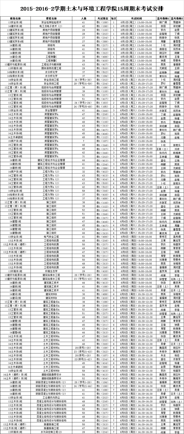 2015-2016-2学期土木与环境工程学院15周期末考试安排
