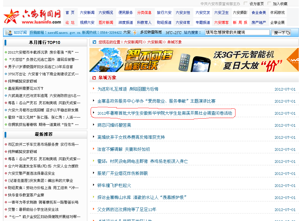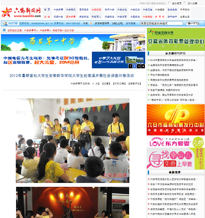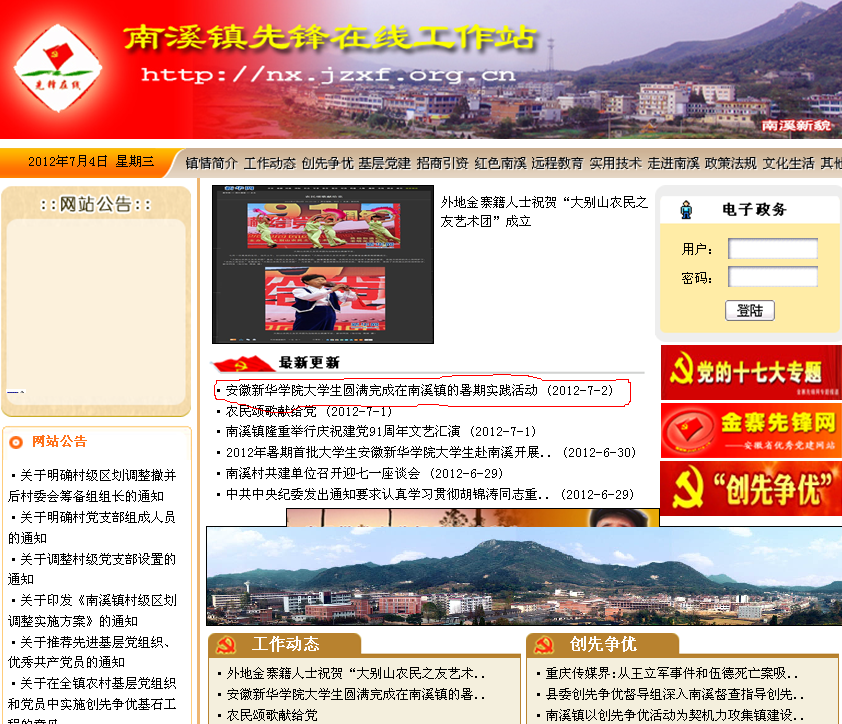 作为2012年暑期第一支进入当地开展“三下乡”活动的实践队,土木学院实践队的活动也引起当代媒体的高度关注,金寨先锋网和六安新闻网分别以《安徽新华学院大学生圆满完成在南溪镇的暑期实践活动》和《2012年暑期首批大学生—安徽新华学院大学生南溪镇开展社会调查活动》进行实时报道。在当地纪念建党91 周年大型文艺汇演的新闻上,也有关于我院实践队的相关报道。此外,金寨县电视台对此次活动也给予了关注。