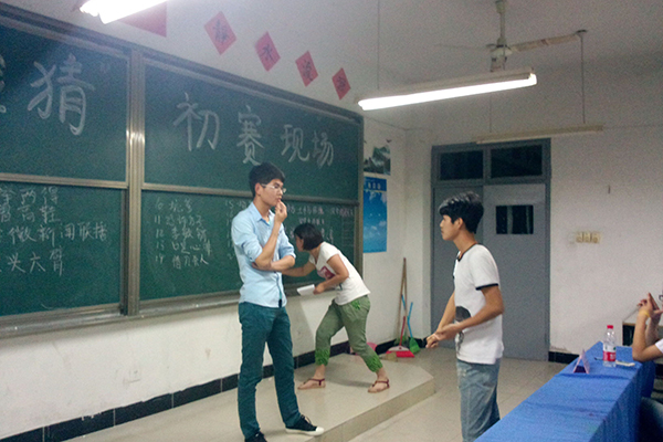 在“你比我猜”现场,一名队友通过肢体表演把信息传递给其他队友,答对者得分。选手们各个争分夺秒,比划出各种惟妙惟肖的动作来展现词语,猜词同学则更是思绪敏捷,整个活动现场气氛十分热烈。