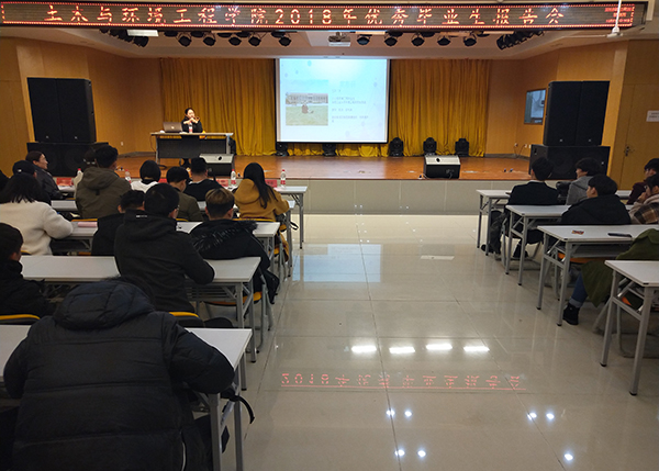 在主持人热情洋溢的开场介绍后,首先由就业突出的优秀毕业生代表,2010级土木工程专业曾勇同学发言,他向同学们分享了自己在土木与环境工程学院学生会期间的锻炼经历和成长收获,自己曲折的求职经历和工作感悟,最后,他着重强调了在大学期间不要盲目的随大流,要有确切的规划,扎实学习,坚持到底才能成功。随后,土木与环境工程学院2013级建筑工程管理专业詹绍炬同学作为优秀创业学子分享了他的经验,詹同学报告风趣幽默,他回顾了自己在校务助理团的工作经历,各位老师对他的帮助指导,介绍了创办企业的艰苦历程,希望学弟学妹们要积极参加社团锻炼,提升自己的综合素质。最后,土木与环境工程学院2018年考取合肥工业大学的2014级环境工程高斯研同学,向学弟学妹们分享了自己的考研心得和备战考研的注意事项,耐心细致地回答了大家的问题。学长学姐们的精彩演讲,充满深情的寄语,打动了现场的同学们,赢得了大家的阵阵掌声。