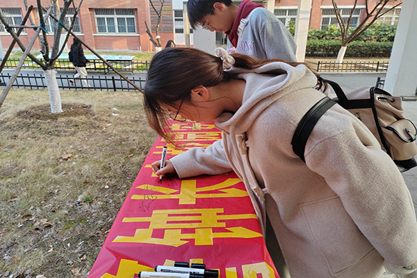 活动现场,一条印有“防范诈骗,警钟长鸣,校园安全,你我同行”的红色横幅成为焦点。学生会主席团成员率先签名,随后学生代表依次在横幅上郑重写下自己的名字。“每一笔签名都是对安全的承诺,我们要做反诈的宣传者和践行者。”2024级新生代表表示,通过活动深刻认识到诈骗的危害,未来将主动向身边同学传递反诈知识。