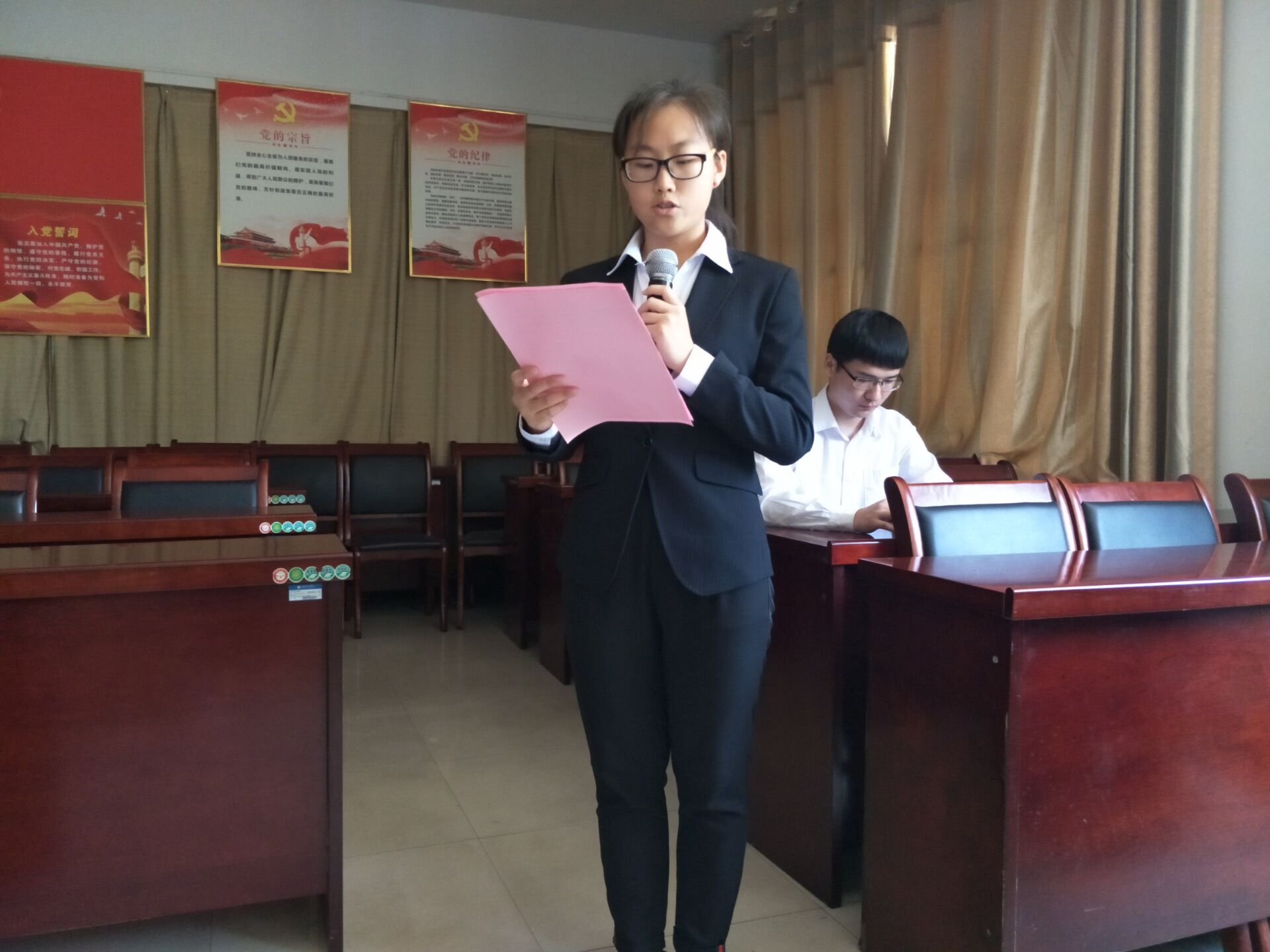 优秀学生党员英培馨同学代表全体新党员进行了发言。她回顾了自己在入党过程中从思想和行动上向党组织靠拢的过程,并代表大家向组织郑重承诺:一定会按照党的要求,坚定共产主义信念,践行十九大精神,积极履行党员的职责和义务,永葆党员的先进性。