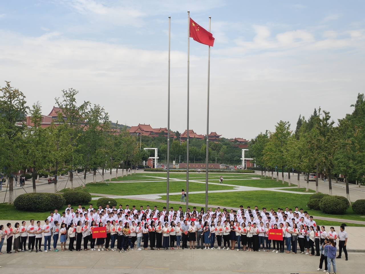 “我和我的祖国,一刻也不能分割,无论我走到哪里,都流出一首赞歌……”随着这熟悉的旋律响起来,大家挥舞着手中的五星红旗,高声歌唱,嘹亮的歌声响彻华园上空,唱响了激情岁月里的红色经典,唱出了大家对祖国的无限热爱。