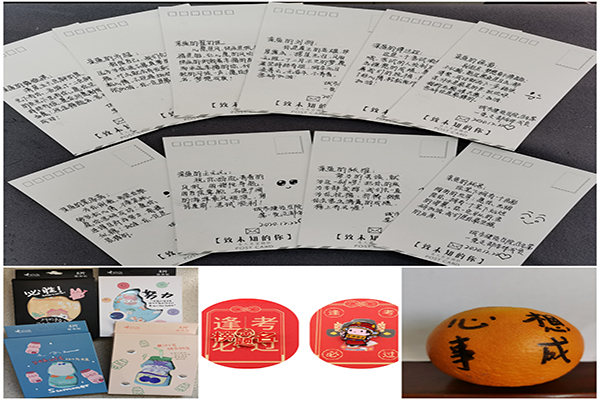 活动前,学生党支部为考研学子精心准备了爱心礼物。学弟学妹撰写好考研祝福语的明信片、御寒的暖贴、支部成员满满的“橙”意、美好祝福的徽章等。备战考研虽很辛苦,但考研路上却不孤单,专属的考研礼品寓意考生们能够金榜题名,顺利上岸,激励考研学子在考场上奋力拼搏,不辜负学校及学院的培养与期望。