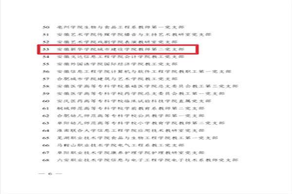本网讯(通讯员:宋红玲 高巧明)近日,中共安徽省委教育工作委员会公布了全省高校“双带头人”教师党支部书记“强国行”专项行动团队名单,安徽新华学院城市建设学院教师第二党支部成功入选,为学校党建“双创”工作再添新彩。